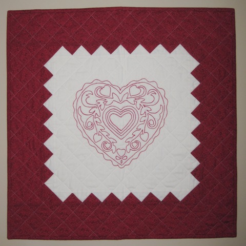 I made this a few years ago and try to remember to hang it for Valentines Day. This year, I remembered! The pattern was from a magazine, not sure which one, but it was supposed to be shadow applique. I hand stitched it as redwork instead. It is machine quilted and about 20 inches square.