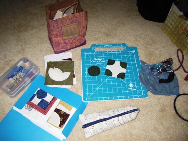 He lives on the west side in Avondale and goes to school at UTI. It was a wonderful week of visiting, playing mom and even cooking for him! While he was at school/work, I did some work on my Dear Jane (or not!) blocks. I got 9 of them finished, only one short of my goal. My son doesn’t have much furniture so I mostly worked sitting on the floor. Here is my set up: