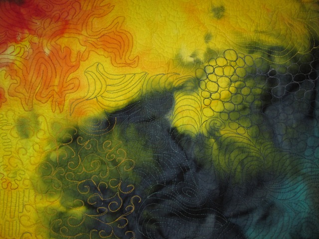 This one is about 14 inches square. I have only shown a part of the piece. It would be a good size for the front of a tote bag….like I need another one of those! Cutting it means small zippered bags…. Hmmmmm…….