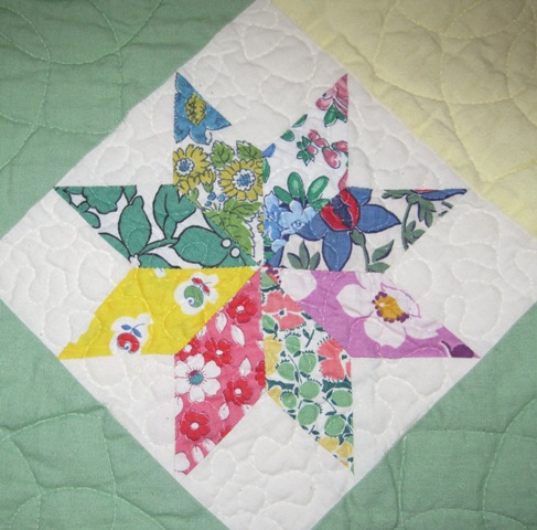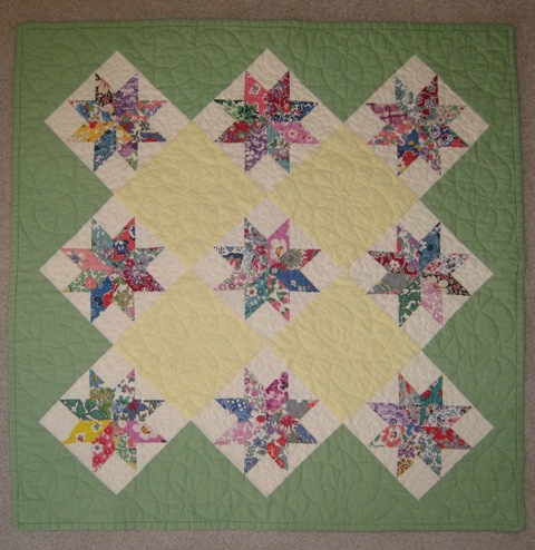 This one was made with vintage 40s fabrics for the stars. It is about 30″ square. This quilt appeared in QUILT Magazine a number of years ago: