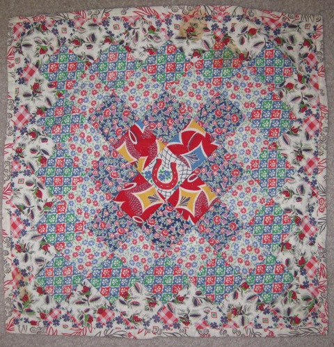 I love these funky prints! The next one is a small doll quilt and I do not know who made it. It is made from feedsacks and measures about13″ square.