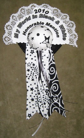 After more than a year, my quilts for the challenge, My World in Black and White are home. Along with my quilts was this lovely ribbon, handmade by Annie Copeland. Isn’t it delightful?