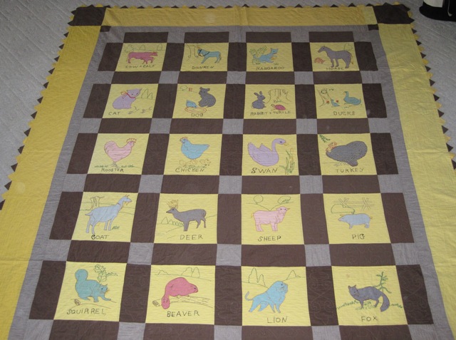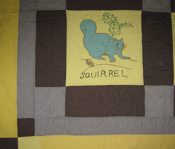 She used all different colors of mini checked ginghams for the animal bodies. She used a narrow zig zag on the edge and not a bit of fusible! Even the animal names she did in a very narrow black zig zag. She must not have had enough of one yellow because there are two different shades used in the border. Here is a close up of the “squirrel! block: