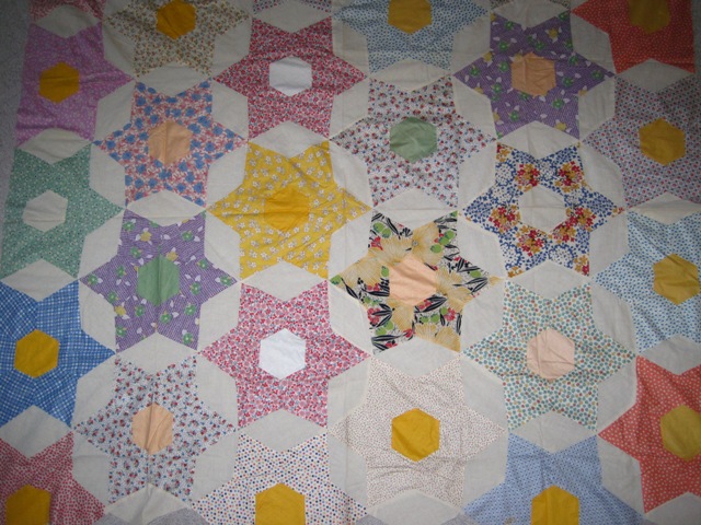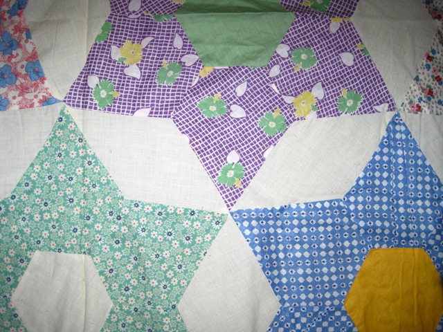 I also bought two quilt tops. The first is a 30’s Star top. I haven’t measured it but it is not huge. It is machine pieced and has a few problems but the fabric is all in great shape and it is very clean.