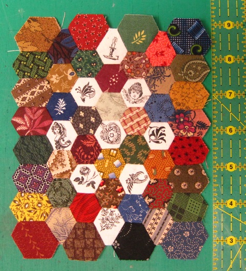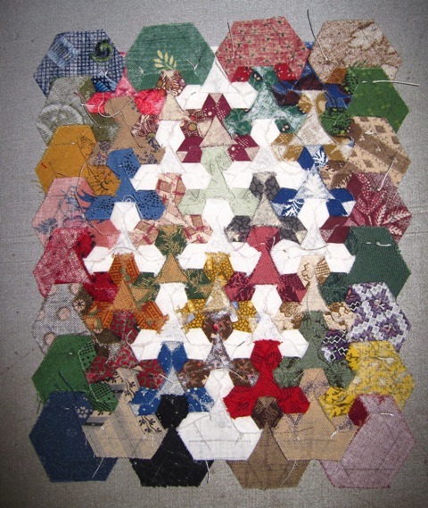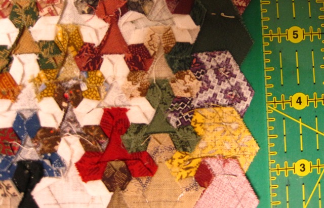 A couple posts back, I showed you a tiny hexagon piece I hand pieced in the car during a trip. I thought you may be interested in how I press the backs. I do not use English paper piecing with my hexagon pieces, I mark the seams and hand piece as any other block. However, when it comes to pressing, I am pretty fussy with these. I ‘twirl the seams to reduce bulk at intersections. This is especially important when working with really tiny pieces! Here is the front again to remind you of what I was working on: