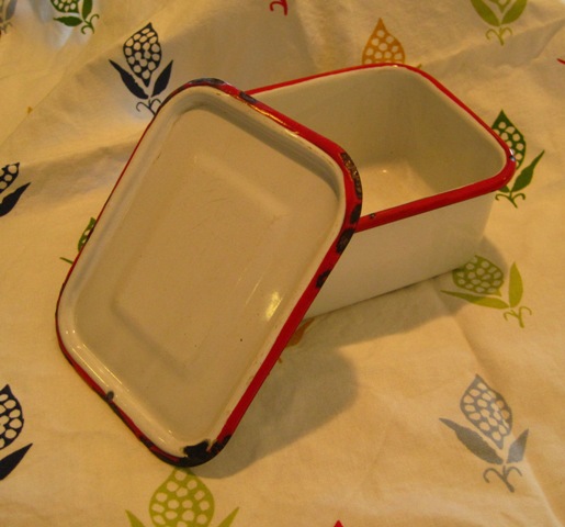 I found this little enamelware refrigerator dish for $2. Admittedly, it is not in the best shape but I love it and will put it to use in the sewing room.