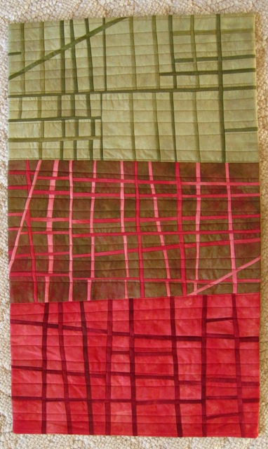 But then my bits languished on the design wall for a couple months. I kept trying to use a piece of hand dyed, manipulated fabric with them and it just wasn’t working. This week, I gave up and tried something else and it came together to my satsifaction. I do not claim this as an original work of art, it is my interpretation of Kathy’s technique and admittedly, looks like it.