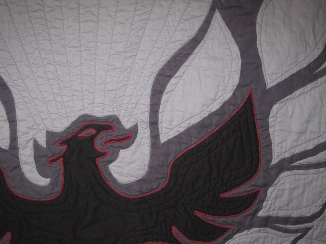 I wasn’t 100% happy with the way it turned out but he loved it and I guess that is what matters! I used a product called Liqui-Fuse on the edges of the bird. This meant that I didn’t have an layer of fusible under the entire surface. I learned this technique from Terry Grant over at And Sew It Goes.