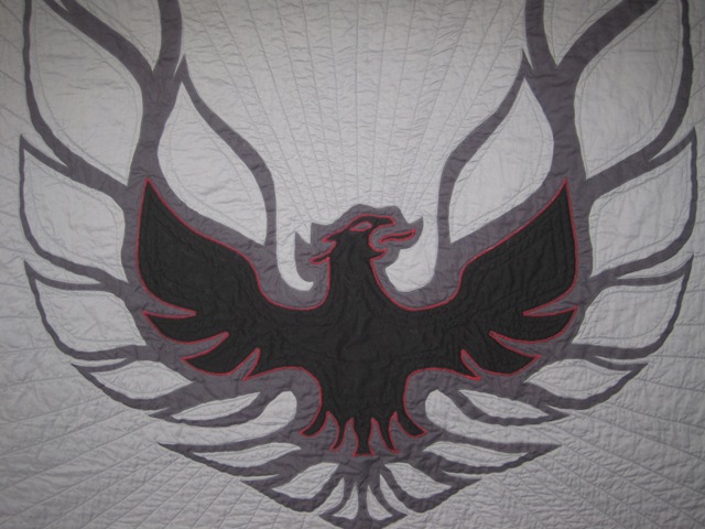 Nice, huh? Anyway, he asked me to make a Trans Am quilt for him and I got it done in time for graduation. Here are some pics of the finished project: