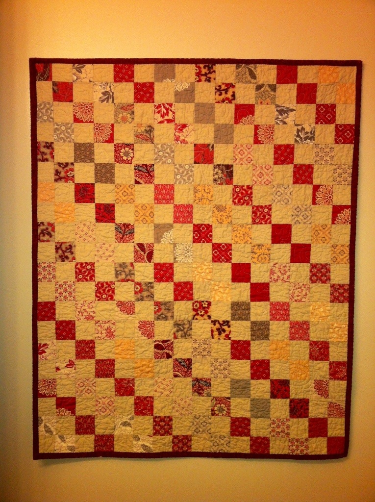 I am still getting to know Barney, my new/used mid arm quilting machine. I am not thrilled with the quilting on this but it is done and hanging up.