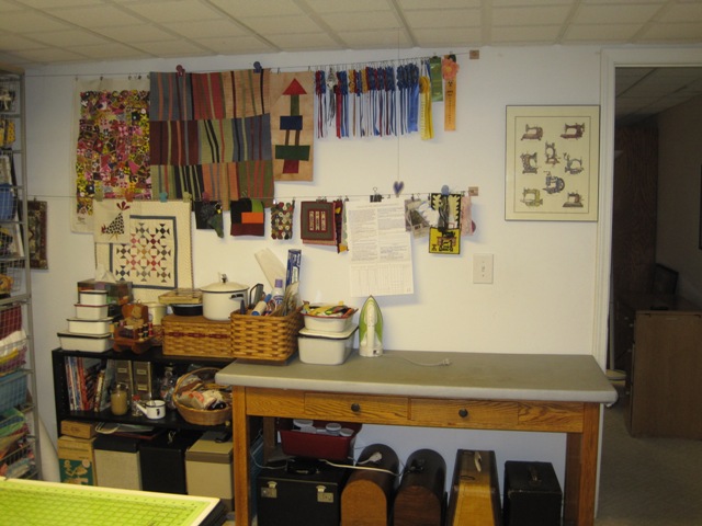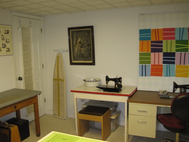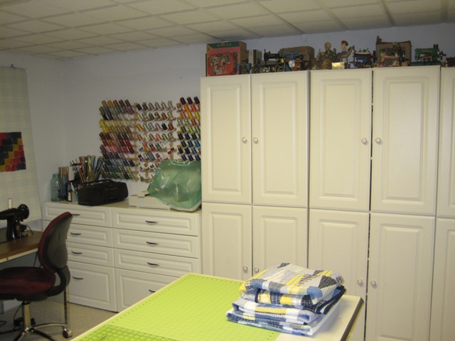 I love to look at pictures of sewing rooms on blogs and thought I would post an updated tour of mine. It has changed again since these were taken but not by much. I got the porcelain tables for my birthday last year and I LOVE them!