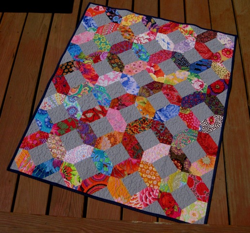 I am quite happy with the gray background and navy binding. I recently purchased a bunch of Kaffee fat quarters when I found a good deal on Craftsy so there will be another Kaffe quilt soon….or maybe later!