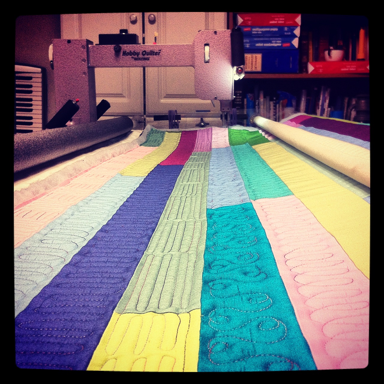 Last summer, I bought a new to me mid-arm quilting machine. It is a Nolting Hobby Quilter. It is non-stitch regulated and sits on a Super Quilter frame. I am not sure this frame is still made. The widest quilt I can put on it is about 72″. I hope that at some point I will be able to purchase a larger frame.