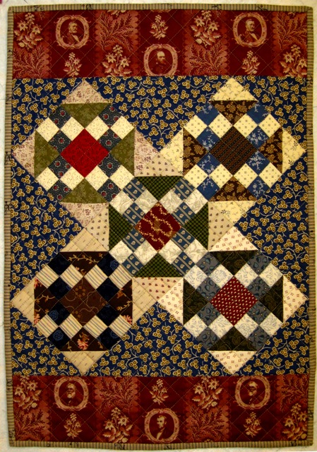 I knew today was going to be a long day at work but I wanted to get this little quilt done! Since I finished the blocks last night, the top went together pretty quickly early this morning. Then I layered and machine quilted it. I even got the binding sewon on before I had to leave at noon. I came home for “lunch” and got the hand sewing on the binding done. After getting home for the night, I took the picture.