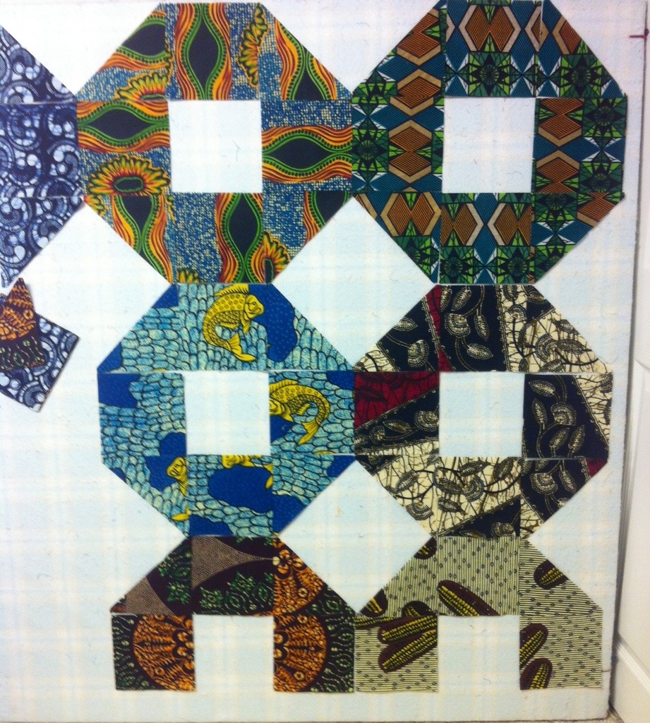 I bought these African fabrics years ago in the fabric market on Paris. I got the idea for using them this way from Malka Dubroski. It will have 9 blocks when finished and they are large at 18″.
