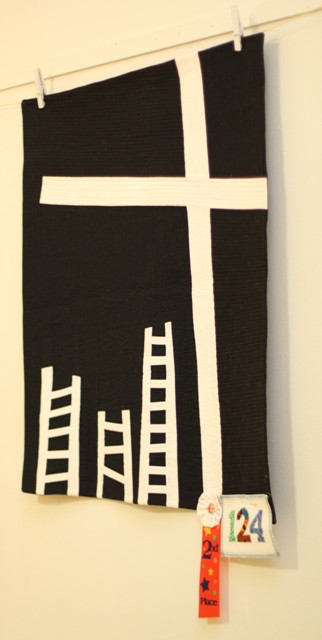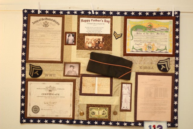 Our local guild is holding its biannual show this weekend. This is the first year I have joined in a long time. Daughter #3 went to the show with me this afternoon and took the following photos. This was one of my favorites, made by Clara Martin in honor of her father’s service during World War II and the Korean War: