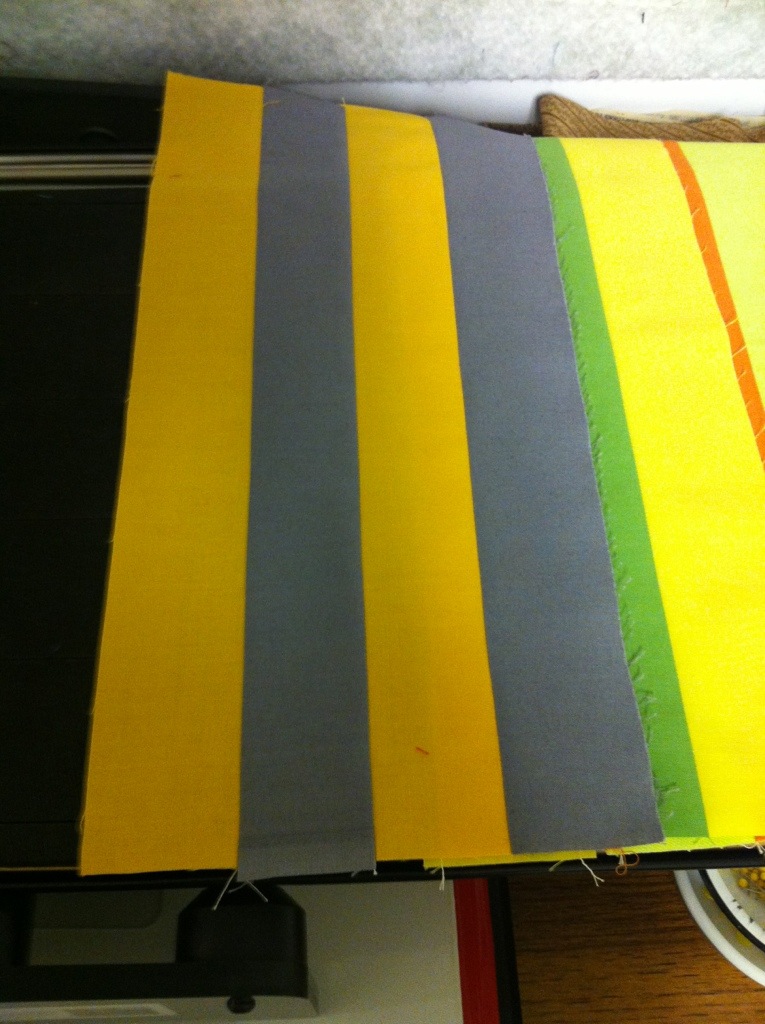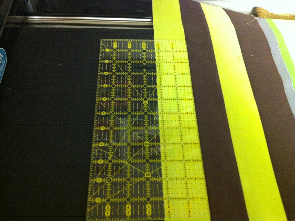 I placed the strip set perpendicular to the blades of the 2 1/2″ strip cutter. I used a ruler to make sure they were correctly placed.
