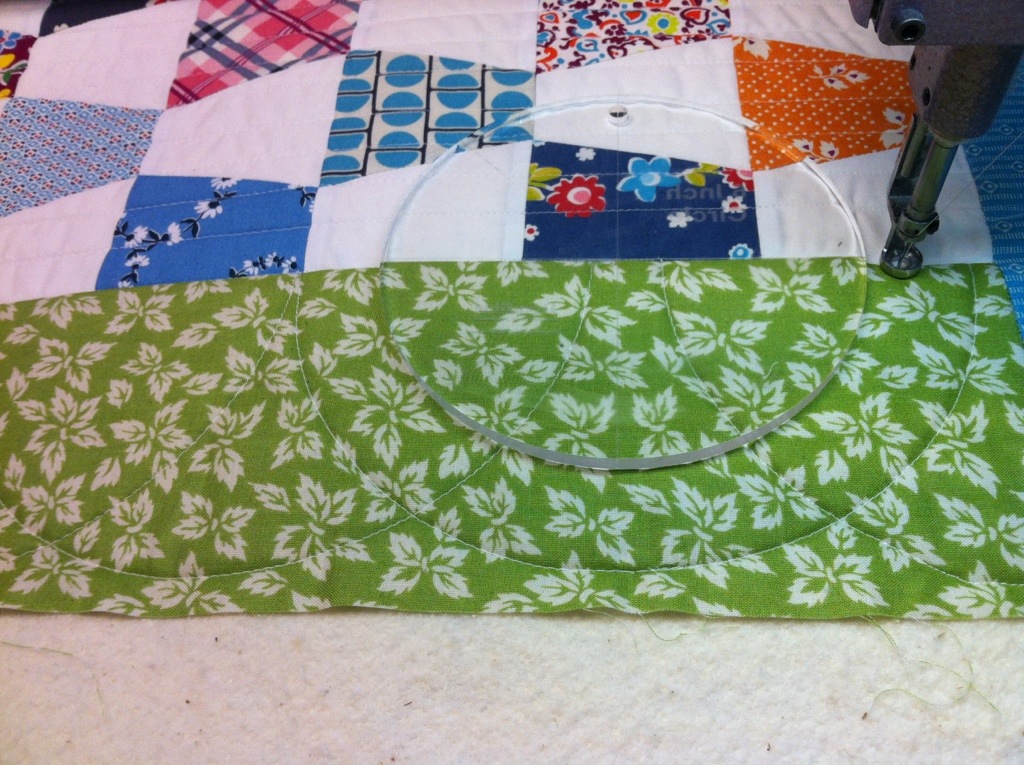 I finally started quilting the tumbler quilt. I purchased some circle templates from Deep Blue and decided to create a border design to try them out. The templates seemesd a bit rougher around the edges than I was eexpecting but they worked fine and the price was fantastic. They are 1/4″ thick so they can be used on the midarm.