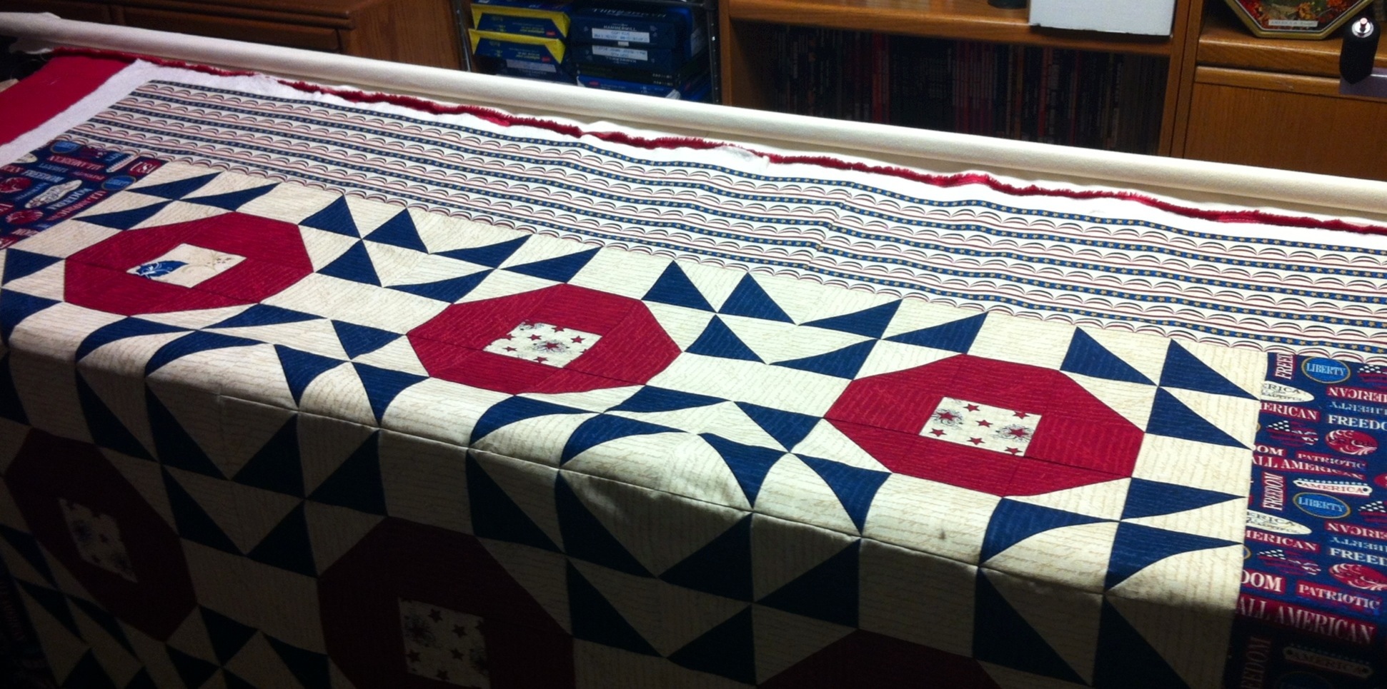 That is such a nice pattern for a QAV quilt. Nice pano also, what pattern is it, like the loops.