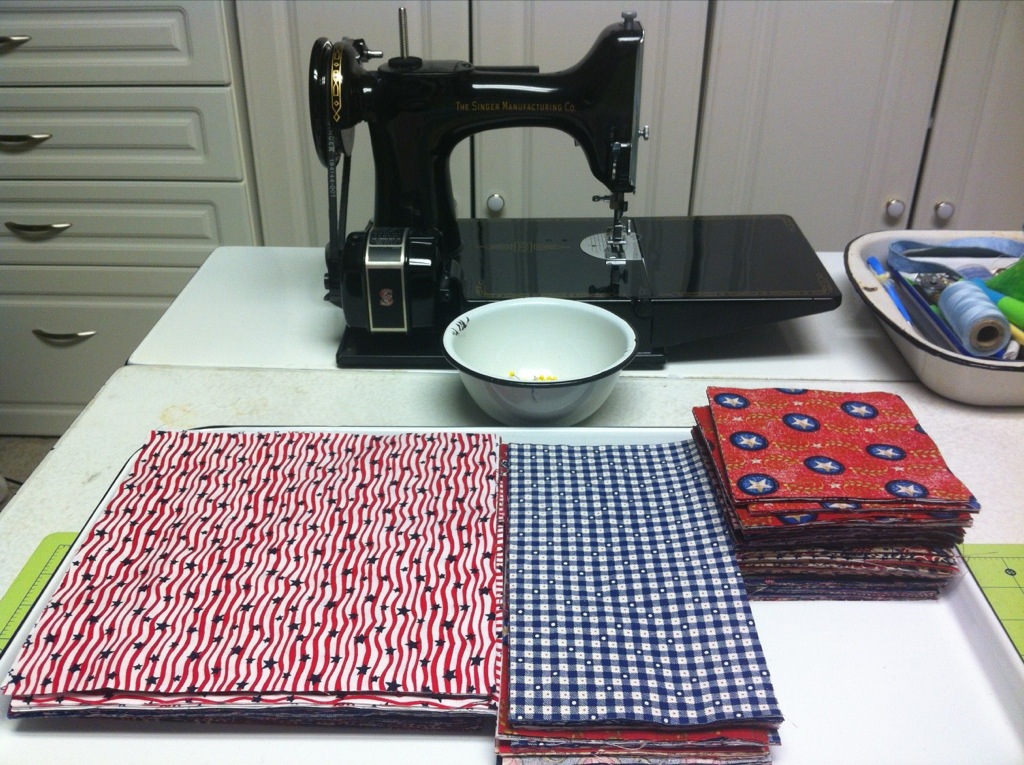 I got a fair amount done last night. I’ve been wanting to make a QOV or two using the Take Five die for my studio cutter. I used this on my daughter’s Type quilt and it went together so fast. Usually, the T5Q is made with just 5 fabrics. The die cuts an 8″ square, three 4″ squares, and one 4″ by 8″ rectangle in one pass (finished sizes). I wanted as much variety as possible so I tried to cut from nearly every patriotic fabric I had. Here are my stacks: