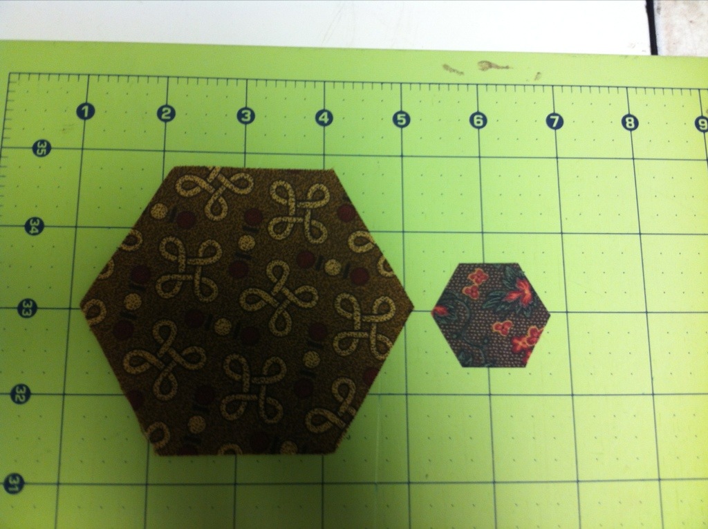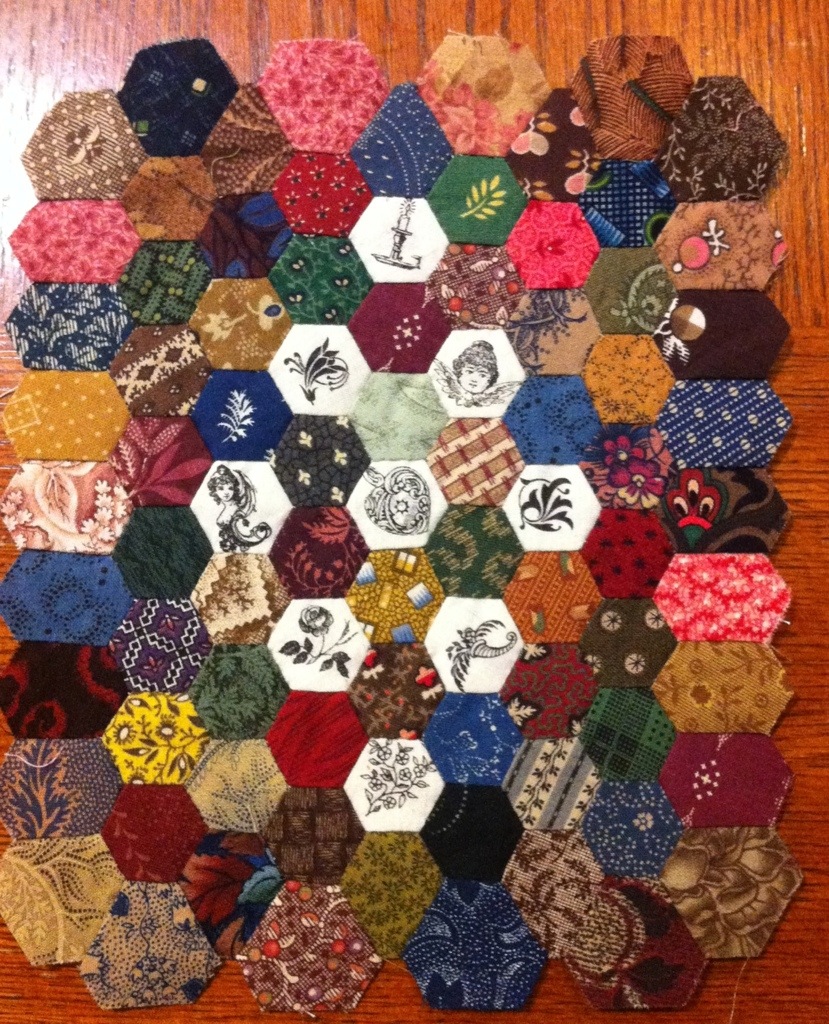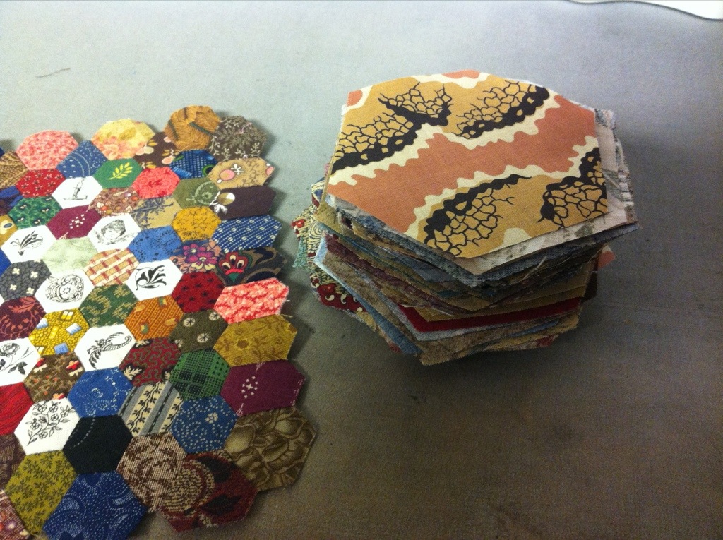 I don’t think I will add any more hexagons but I need to figure out how to finish it. Right now, it measures about 6″ x 8″. I also marked seams on these hexagons while we traveled yesterday.