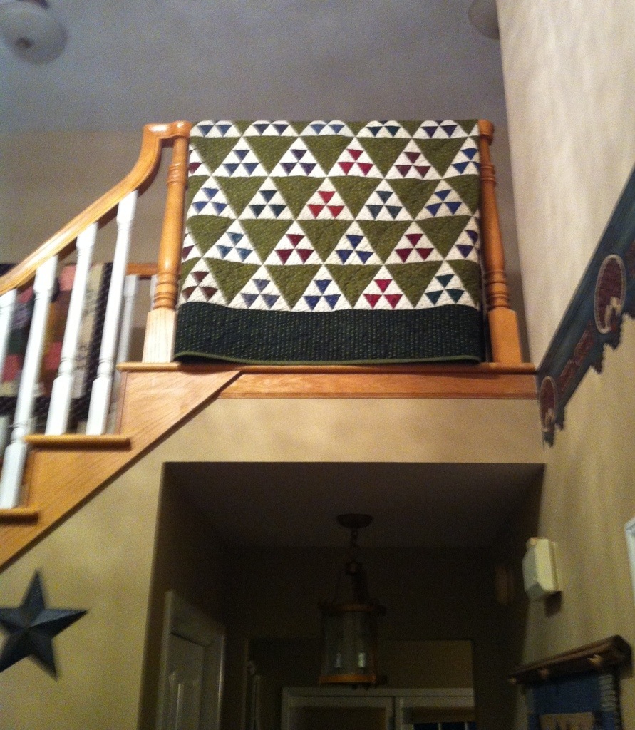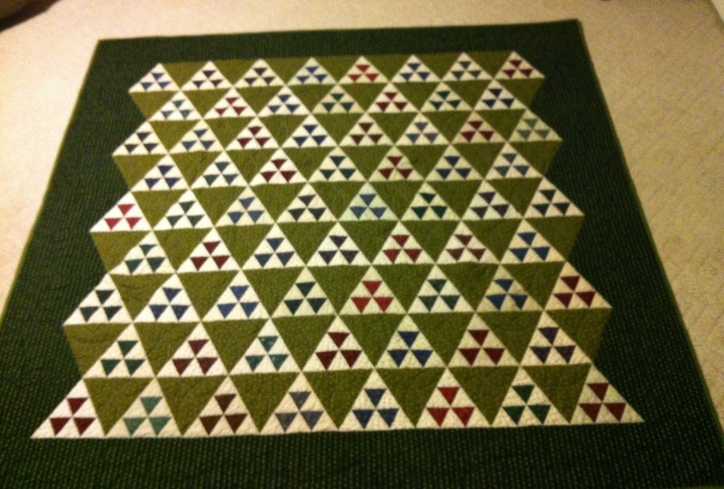 I finally finish this miserable thing and throw it in the wash. Watch a cheesy movie with DH and stew a while. Pull it out if the dryer…..too embarrassed to show you the back. Realized I missed quilting two arcs in the green triangles. Nuts.
