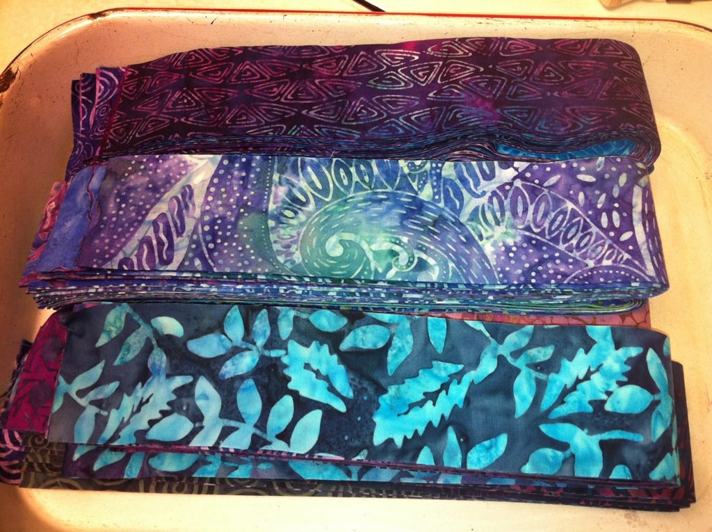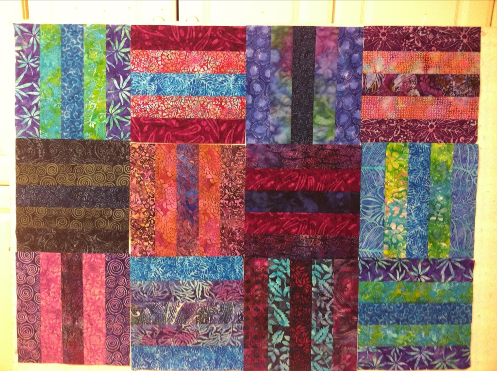 I cut just under a million strips from batiks last week for my MILs king sized quilt. She has called to inquire about my progress so I decided I could put it off no longer. It is time to peace out I mean piece out.