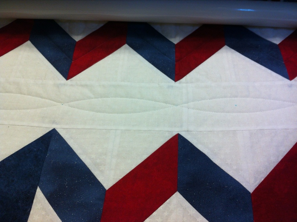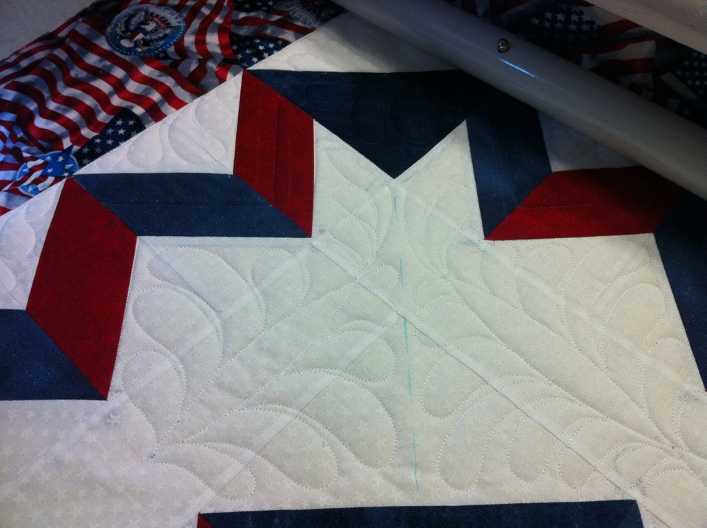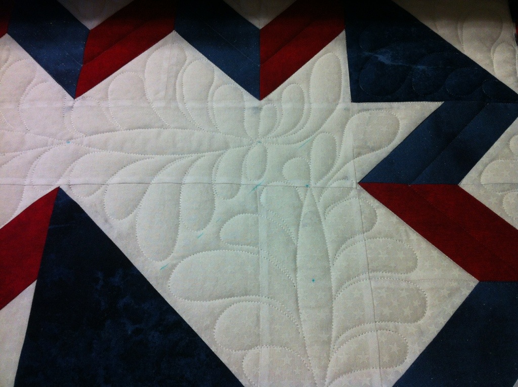 Yes, I finally started the quilting on this QOV. It is slow going. I had my heart set on feathers for this. I decided to do piano key border and feathers in the white.