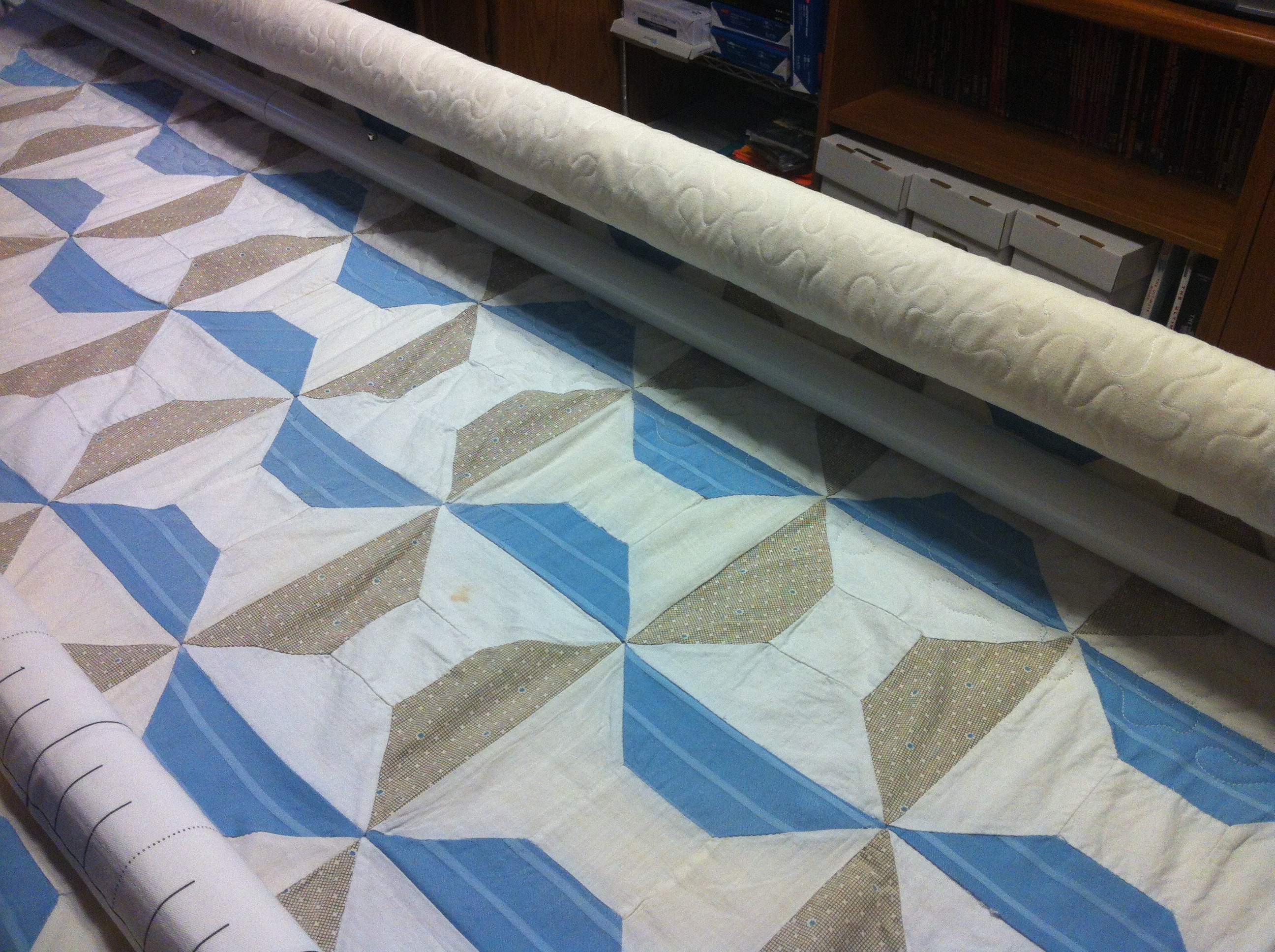 I finally started quilting the vintage top I purchased and loaded. After consulting with the Home Machine Quilting Systems Yahoo Group, it seemed that a meander would be the best choice to eat up the extra fabric in the blocks. Here are some pics so you can get an idea if the fullness I am dealing with.