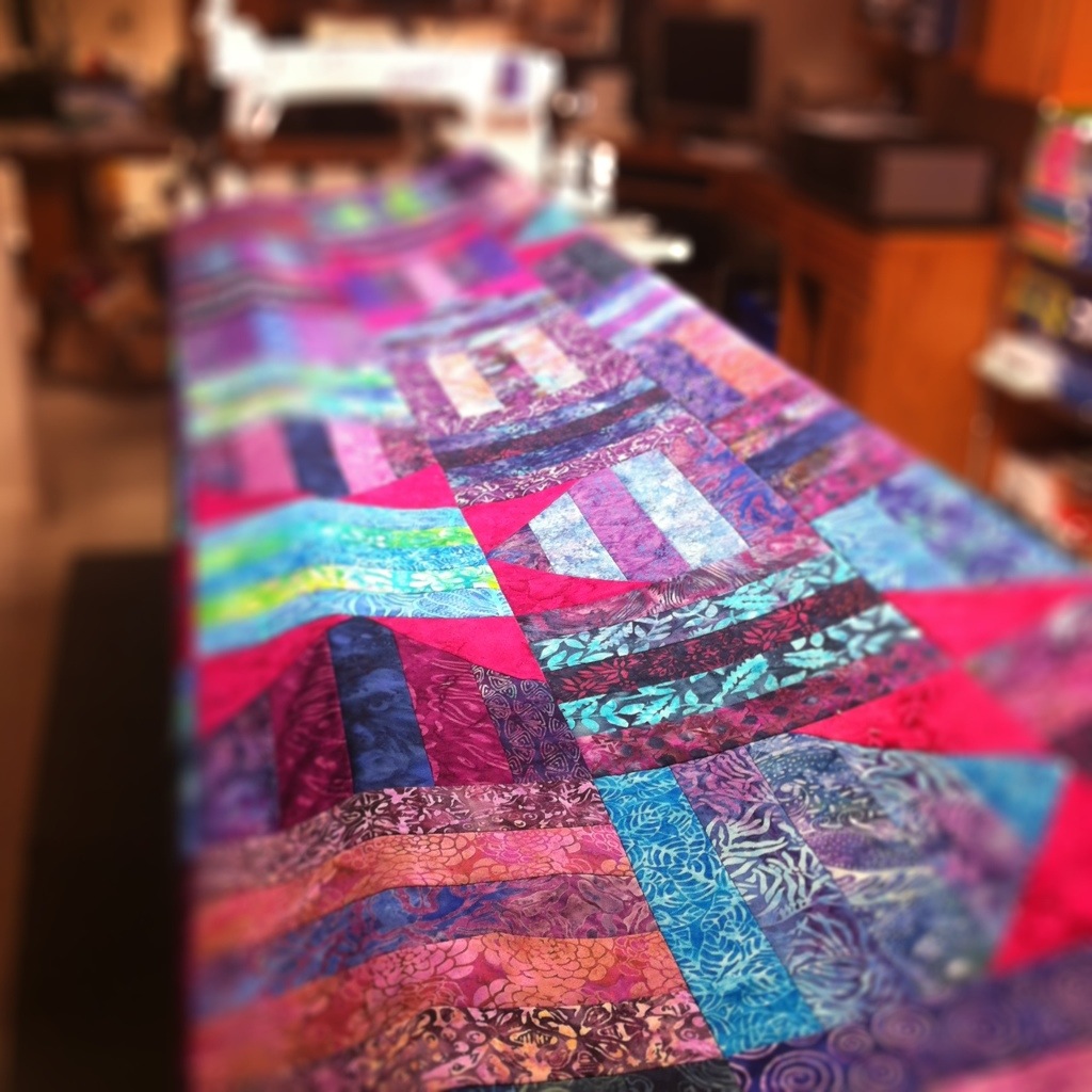 First the good news, I finished piecing the top for the king size batik behemoth. Yay! I washed the backing and loaded it on the frame…..bad news time…..it shrunk so much it it now too narrow for the top!