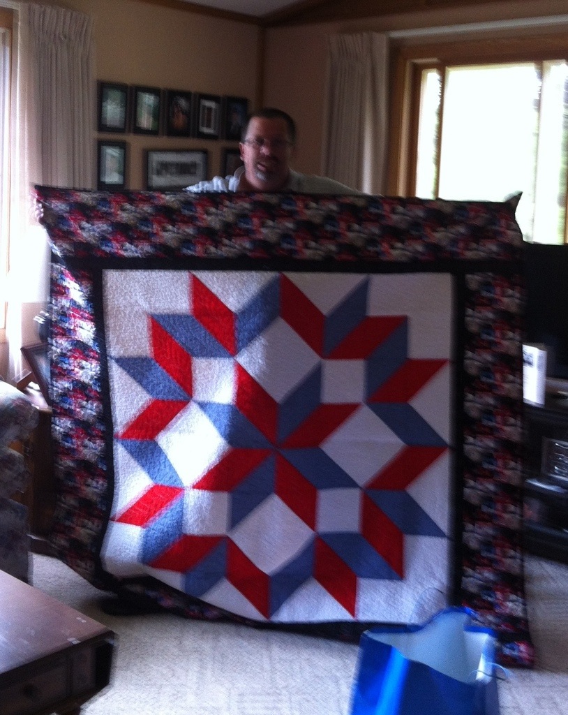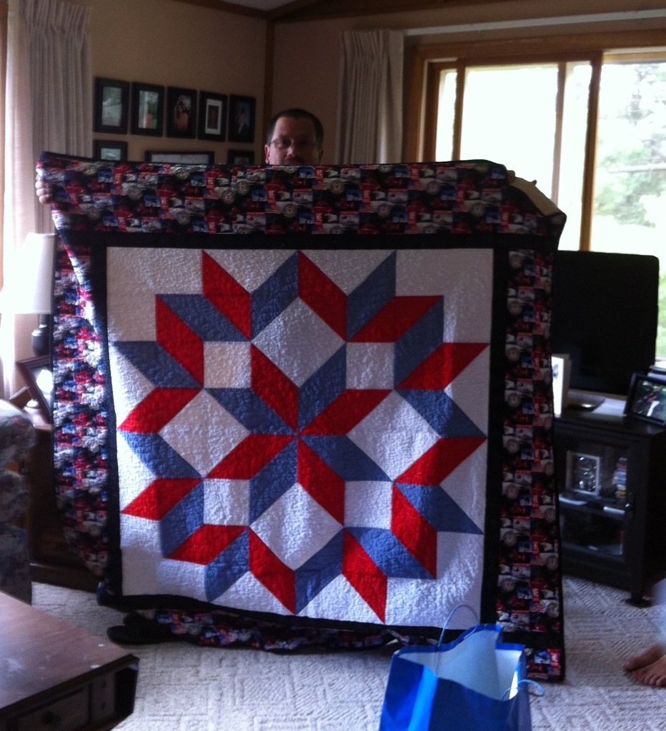 Sorry about the terrible pictures. I need to slow down and not rush that part! He was very surprised as well and loved the Coast Guard fabric.