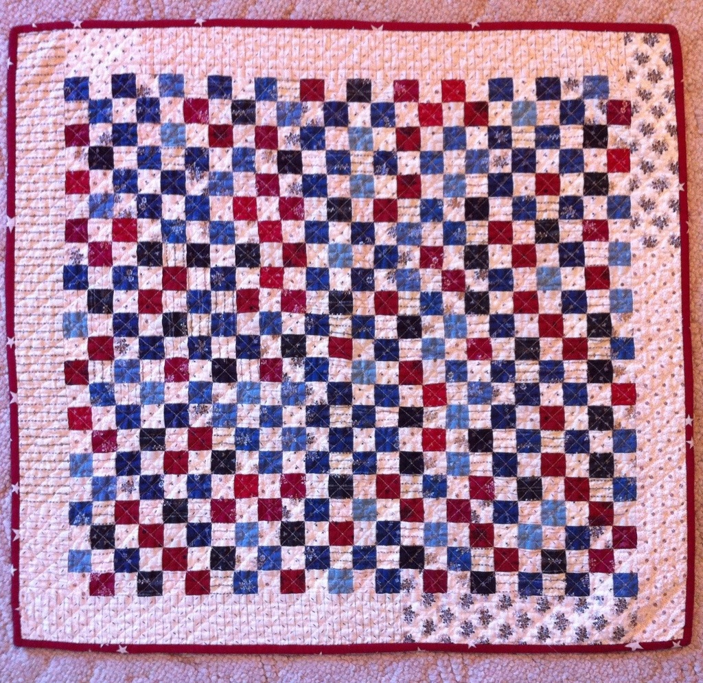 And because every quilting blog needs quilt pictures, here is a small quilt I made several years ago. Lately, I have been using it on my kitchen table. The fabrics are all reproduction prints and the squares measure 1″ finished. It looks a little wonky to me, might have been a PMS quilt. Regardless, I like it. Reminds me that things don’t have to be perfect to have value.