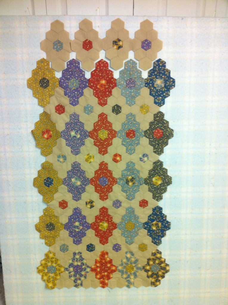 I got quite a bit more done on the hexie project on the trip home on Monday. I pieced the tan diamonds for the next row and added th top row to the main piece. I have one more row of dark diamonds to add and then need to decide what to do from there.
