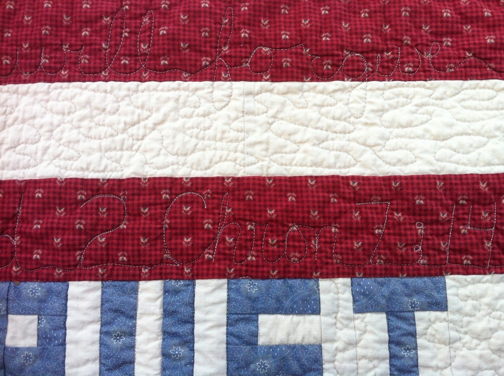 In the red stripes, I have quilted 2 Chronicles 7:14 which says: