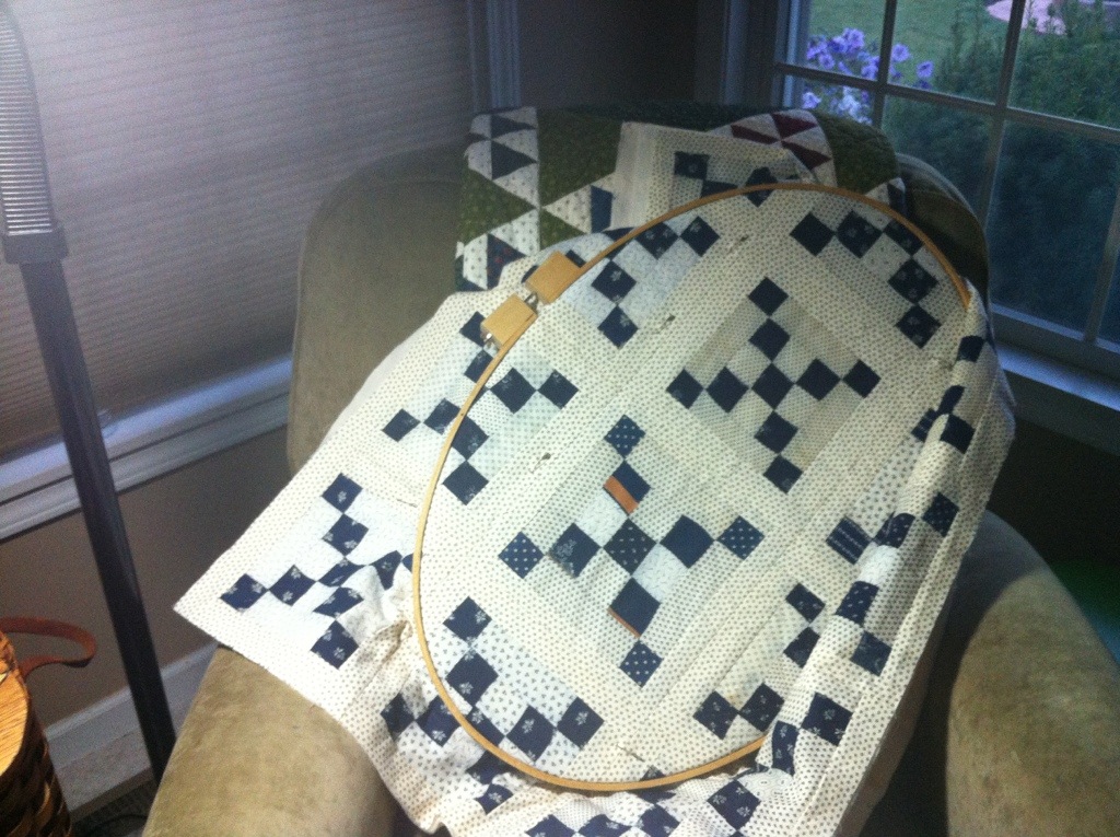 I haven’t done any hand quilting in ages and wow, I am rusty! Yikes! I am seriously thinking about ripping out what I have done and putting this on the frame for machine quilting. It will not be heavily quilted.