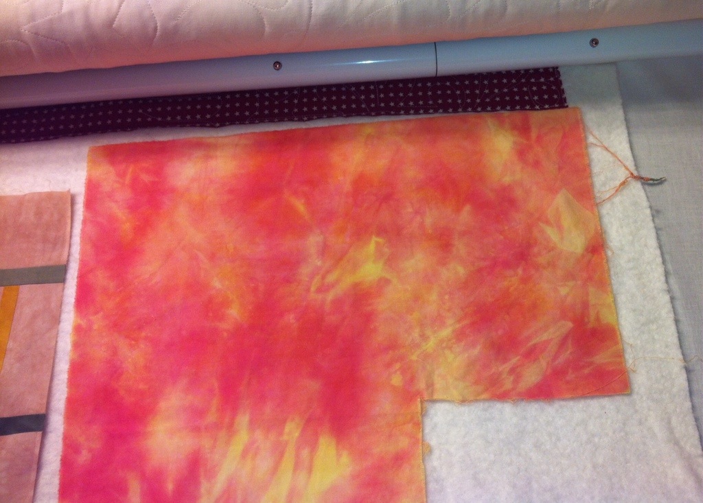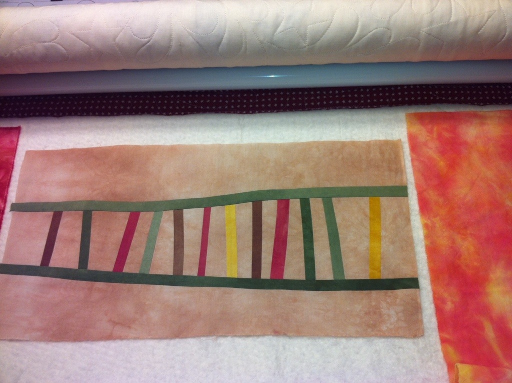 The two orange pieces are hand dyed by me. The ladder was pieced by me and I dyed the fabrics as well. I haven’t quilted many “art” quilts on my Avante yet so this should be fun. I also hope to get the QOV off and bound yet today.