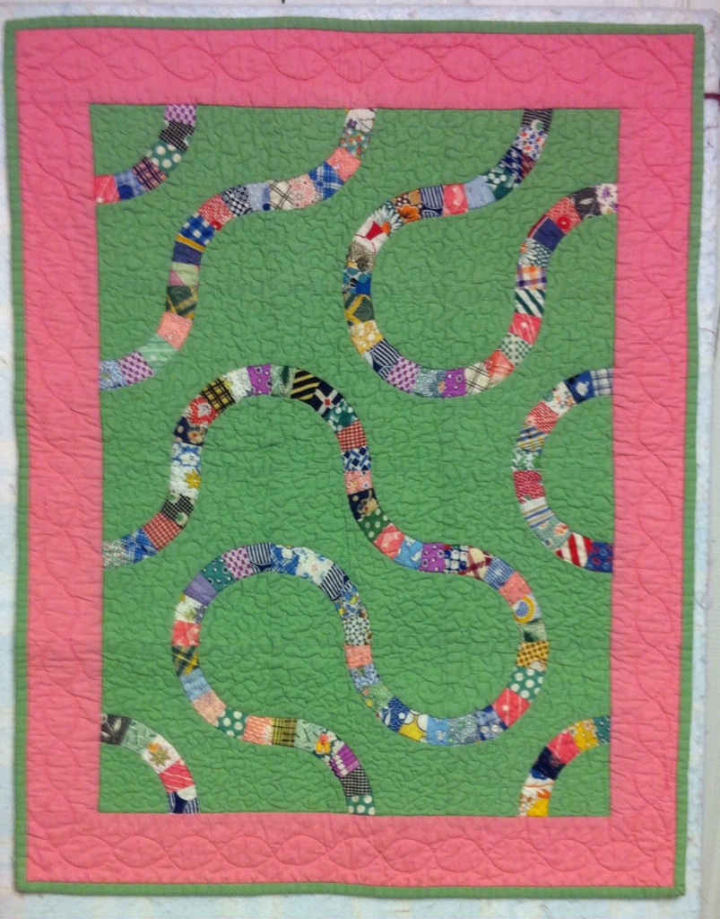 I think the squares in this one are about 1 1/2″ finished. Again, vintage fabrics except for the border.