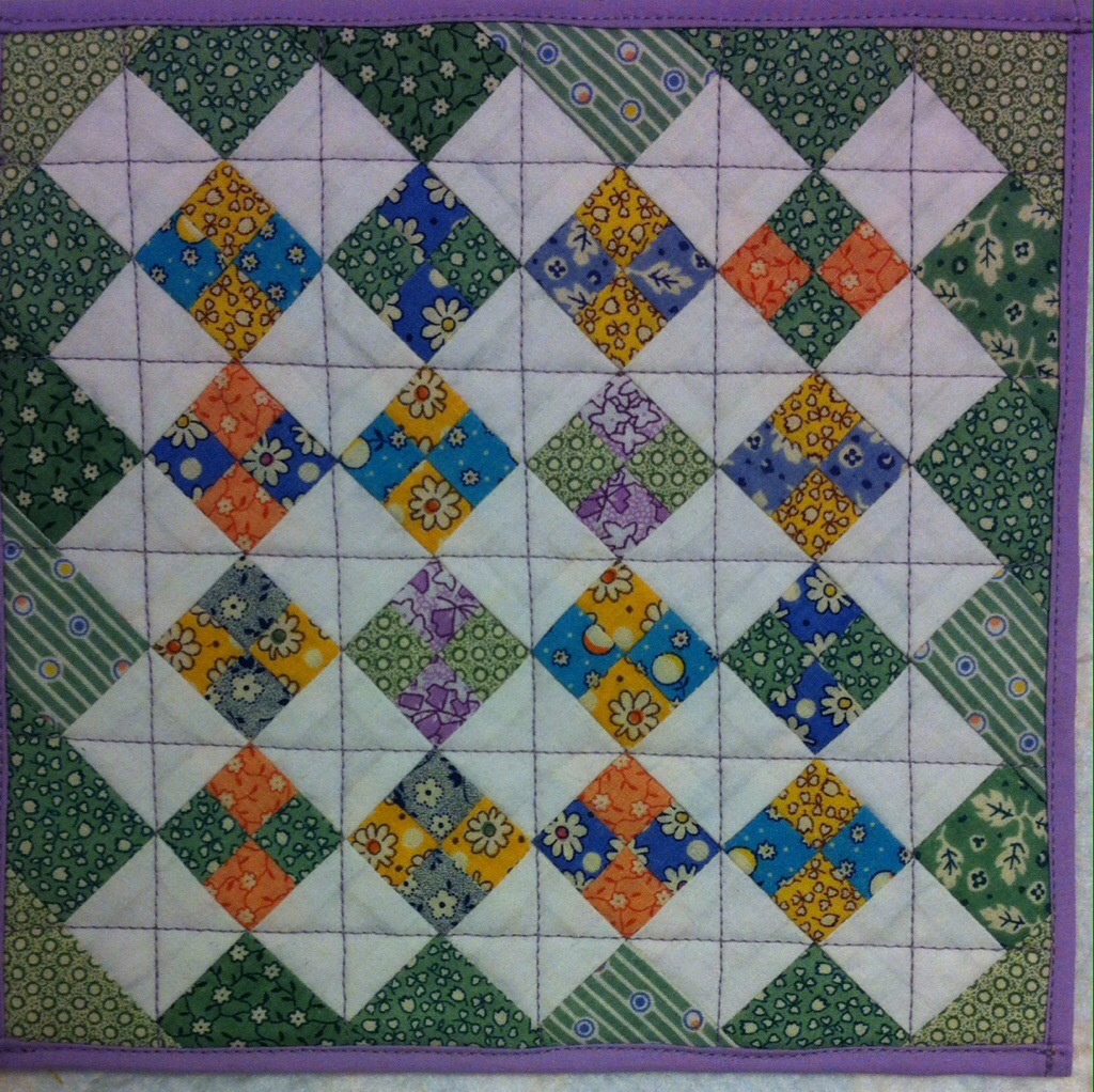 Repro 30s fabrics. Four patches are one inch. Quilted with lavender thread.
