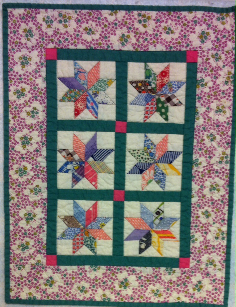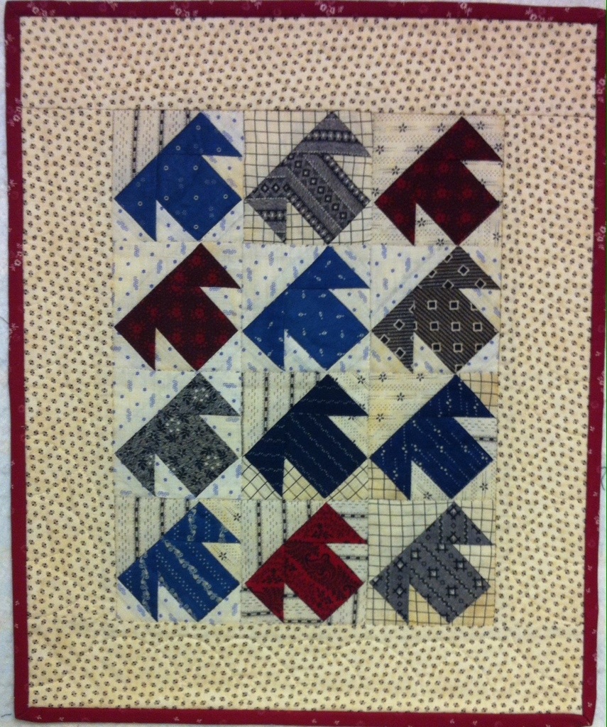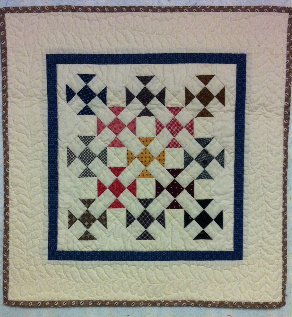 The background fabric is new but the colored fabrics in the churn dash are vintage. The blocks are 3″.