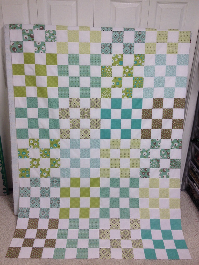 I was able to finish the 16 patch blocks and get them sewn together before work yesterday. I am going to add 6″ white borders yet.