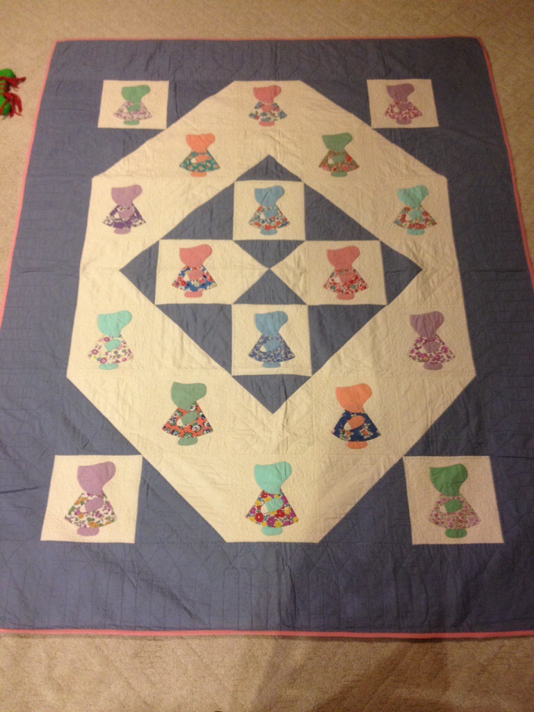While I was getting ready for company, I found this quilt that I made for Daughter #1 long, long ago! Sorry for the bad picture.