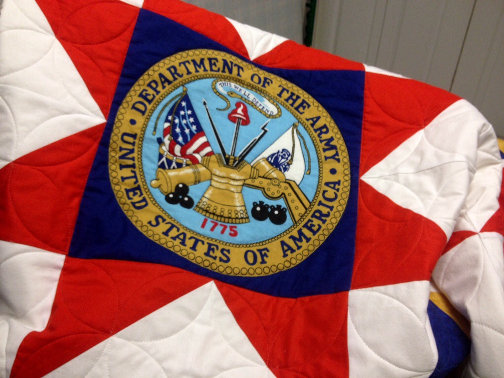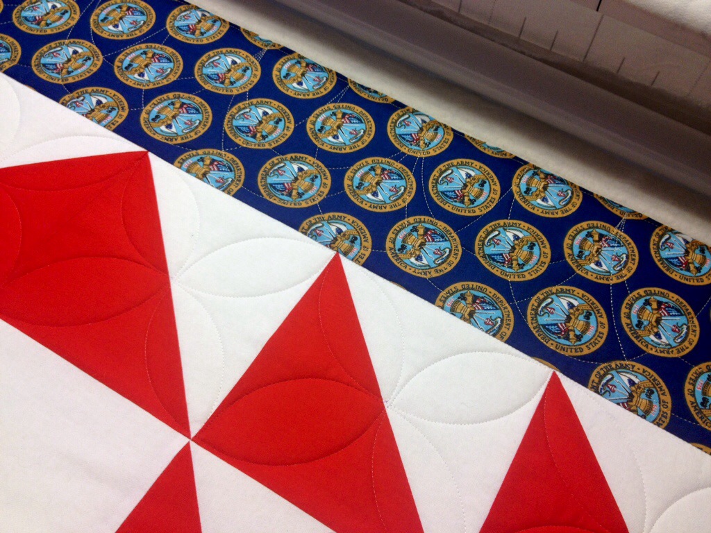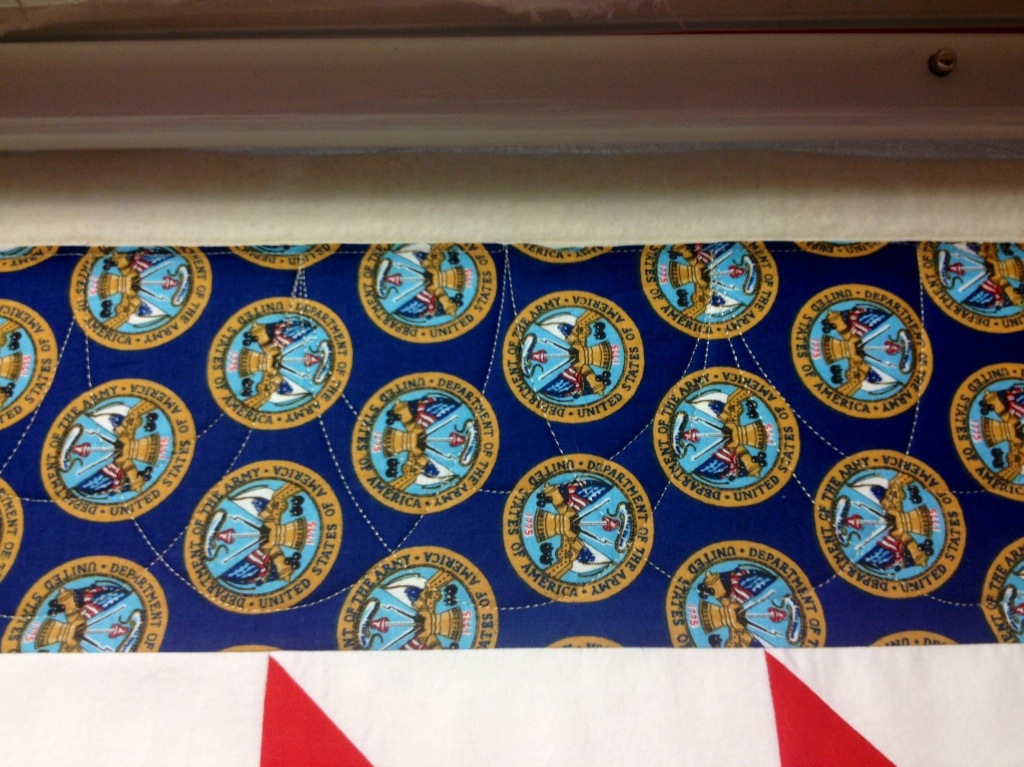 I did an all over teacup in the center, except for the Army seal in the center, and used my Handi Quilter Swag set to create the border design. I need to do labels and presentation cases yet this week and then I will be done with QOVs until February. I love making them but I need to make some Christmas gifts. Also, January will be reserved for me and the quilts I want to make. Sounds pretty selfish, doesn’t it?