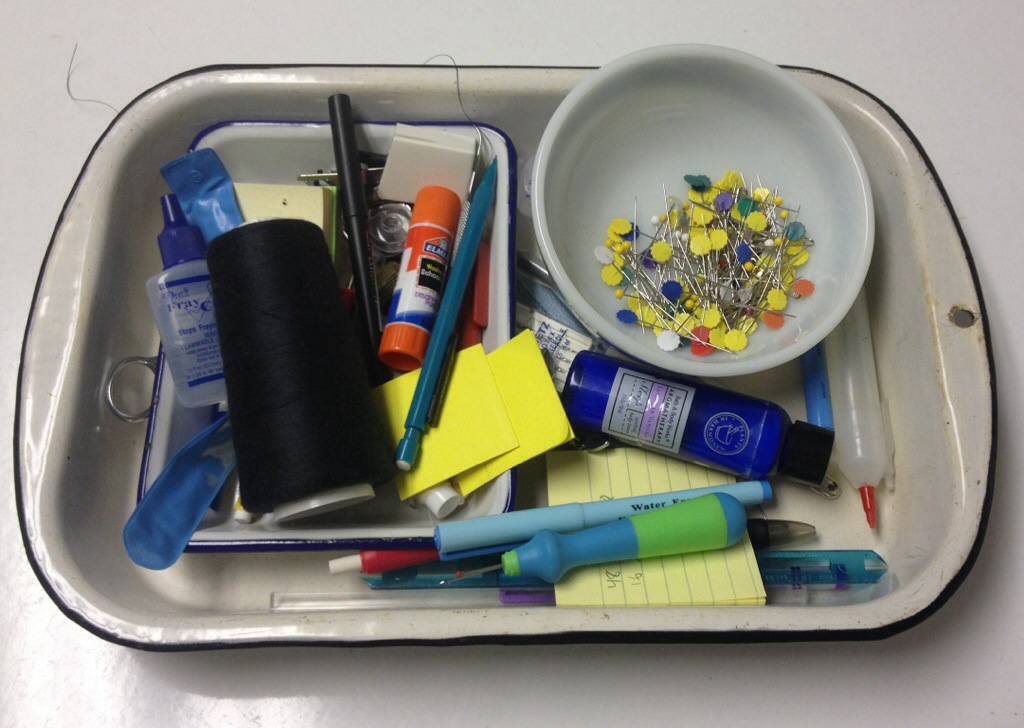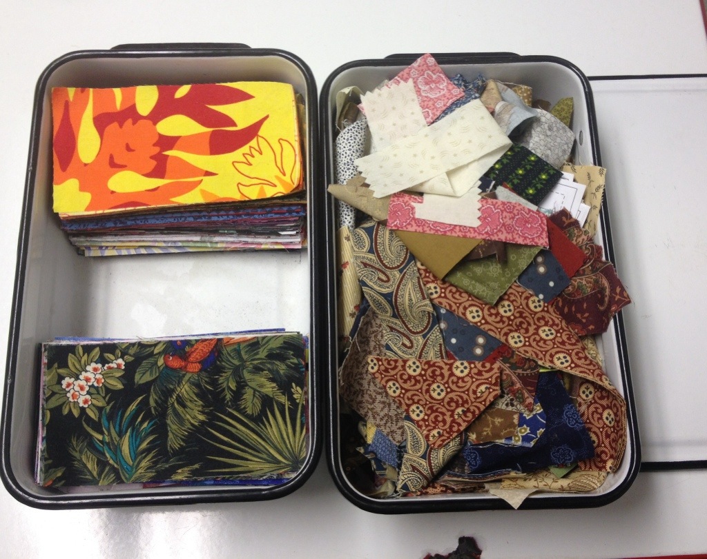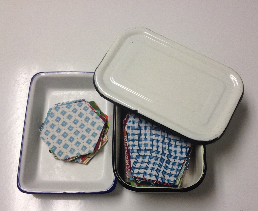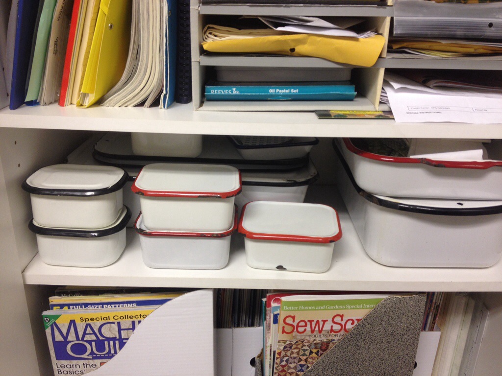 Vicki at Field Trips in Fiber has been hosting a REAL studio tour link up. This week she asked and shared her ideas for storage. My favorite storage containers are vintage enamelware containers like this: