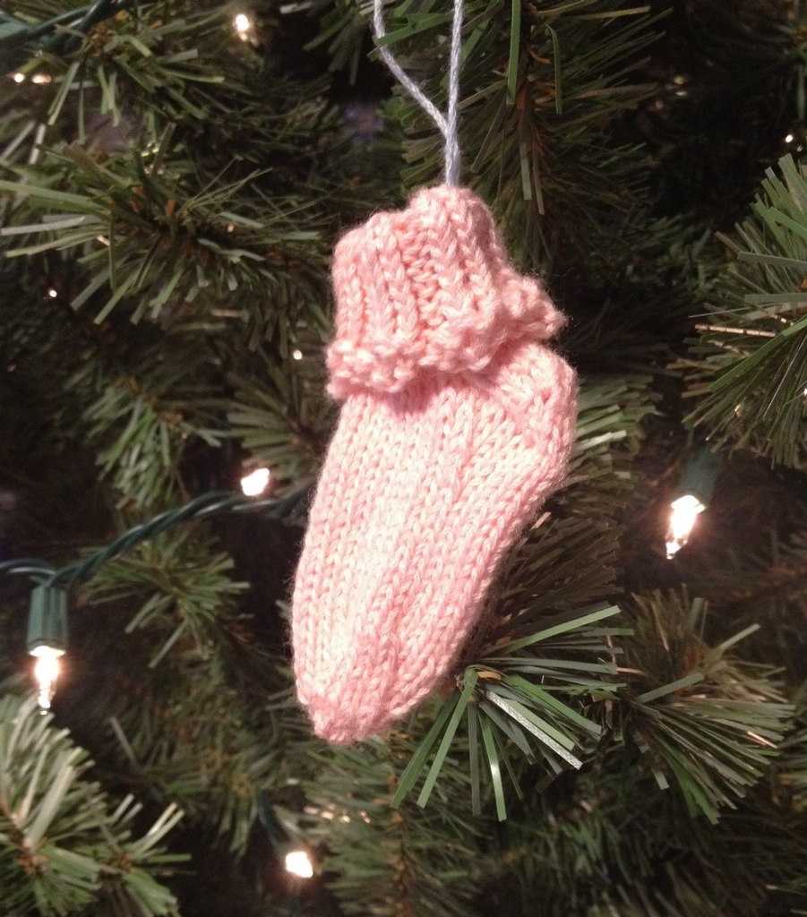 I made a tiny pink sock earlier that ended up way too small. I decided to turn it into a tree ornament for my daughter.