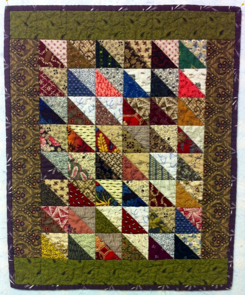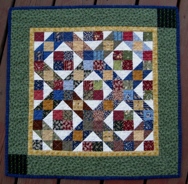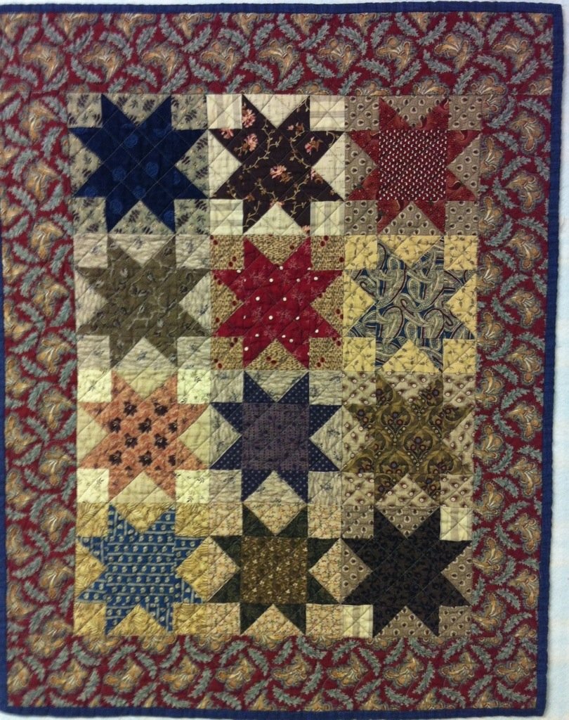 Early last year, I joined the Small Quilt Talk (SQT) group on Yahoo, hosted by Kathy Tracy. She has written several delightful books of small quilts and uses one of her patterns each month as a challenge. I joined in February but went back and completed a quilt for January. The only month I missed was June; it was applique!