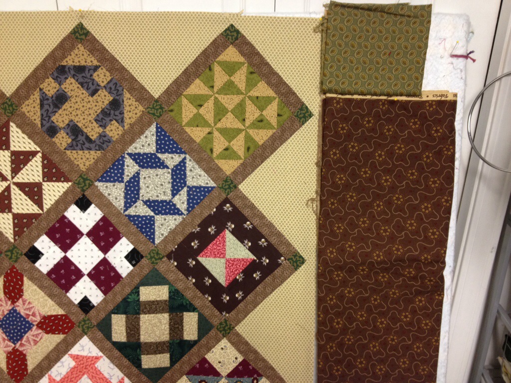 I got my Farmers Wife blocks together. I decided not to add anymore blocks after all. Now I am auditioning borders.