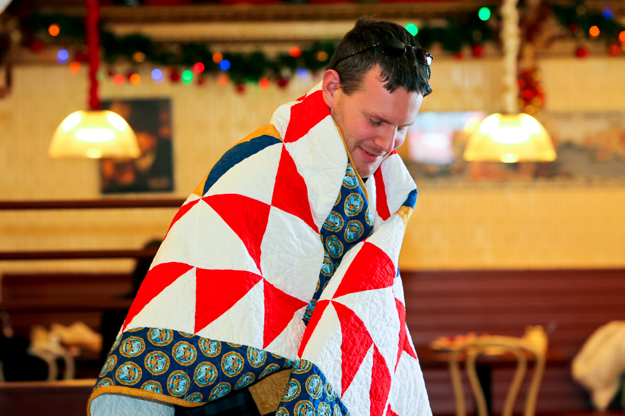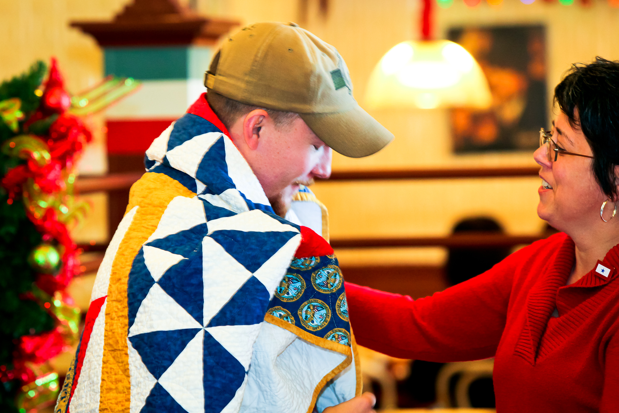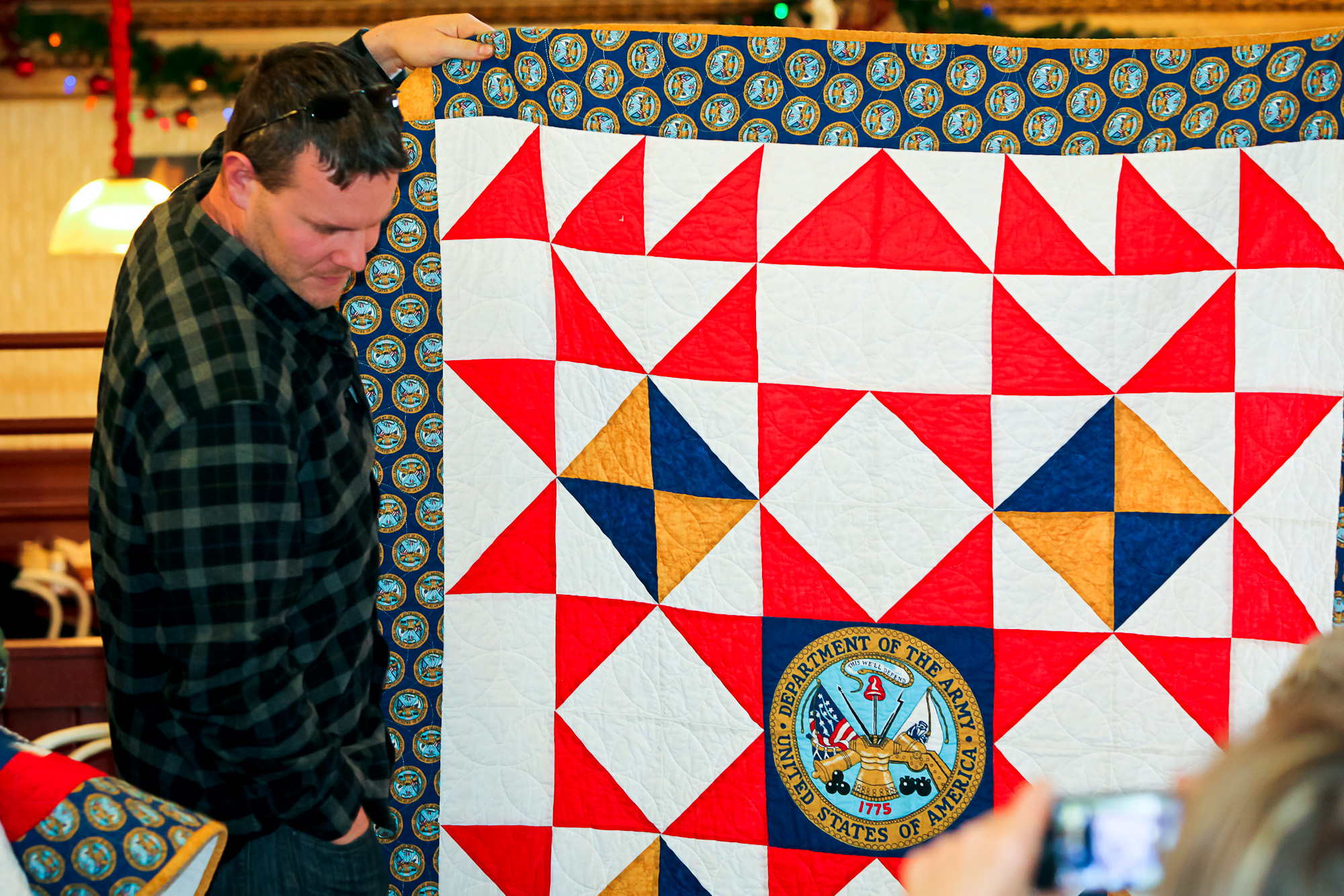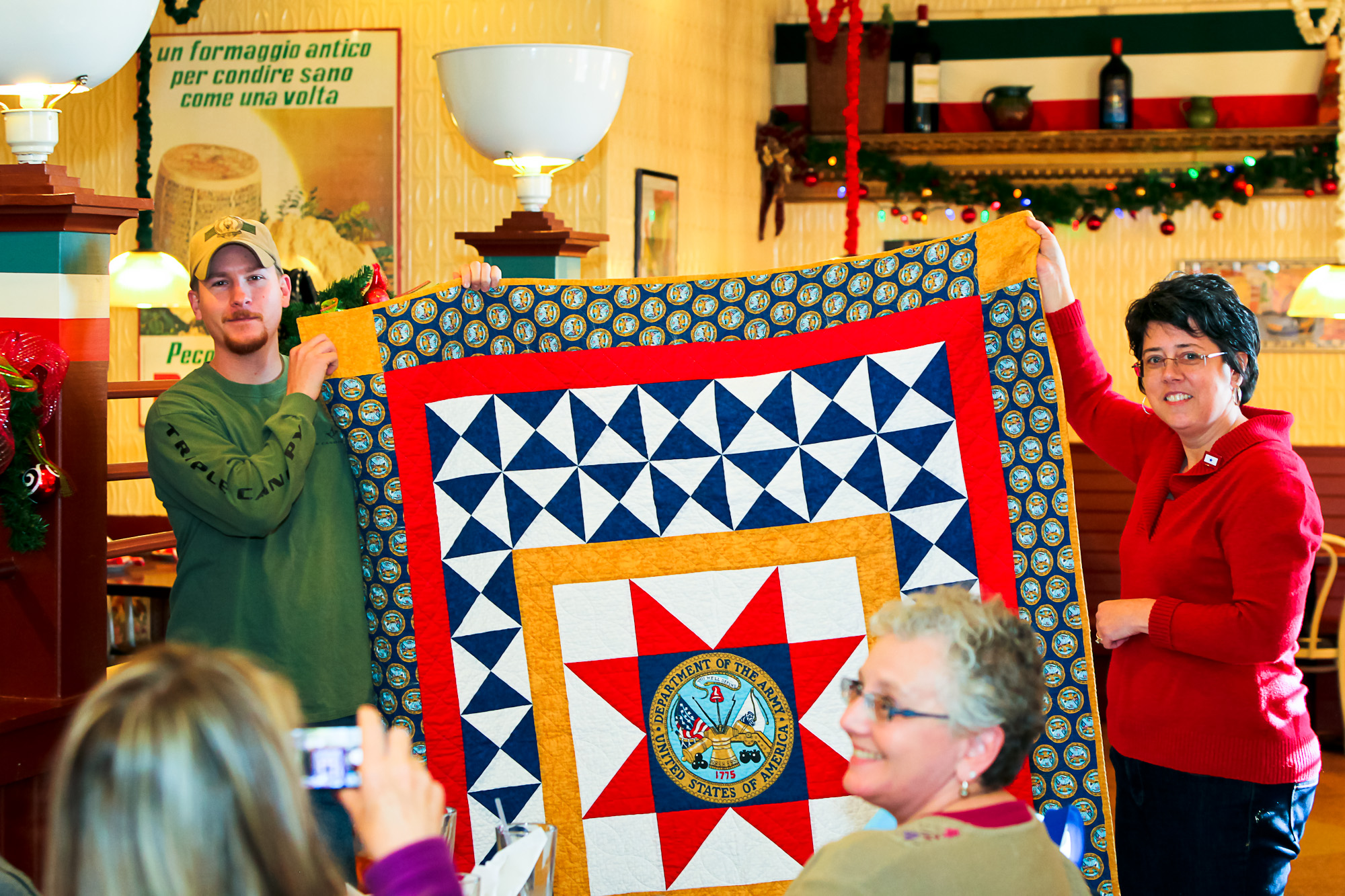 I already blogged about this here but now I have pictures! On December 28, 2013, I had the privilege of presenting Quilts of Valor To David and Peter. These two brothers both served in the Army during the Iraqi Freedom Campaign. A coworker of mine has been friends of this family for years and had asked me to make QOVs for the brothers. She arranged for us to meet at a restaurant and have lunch before the presentations. I believe there were about 12 family members present. My coworker’s husband is a photographer and he captured the most wonderful pictures that day.