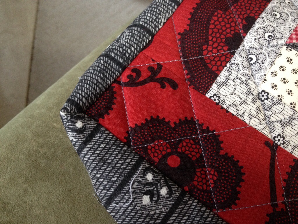 I spent a little time hand sewing the binding on my SQT challenge quilt today.