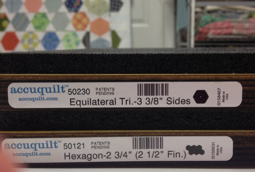 I know, they look like they don’t go together, but they do. The hexagons have 2 1/2″ FINISHED sides. The triangles do too but the measurement listed here is UNFINISHED. Why did Accuquilt do this? I have no earthly idea. Trust me, they work. (ETA: I knew they were compatible because Accuquilt will list compatible dies in the product info.)