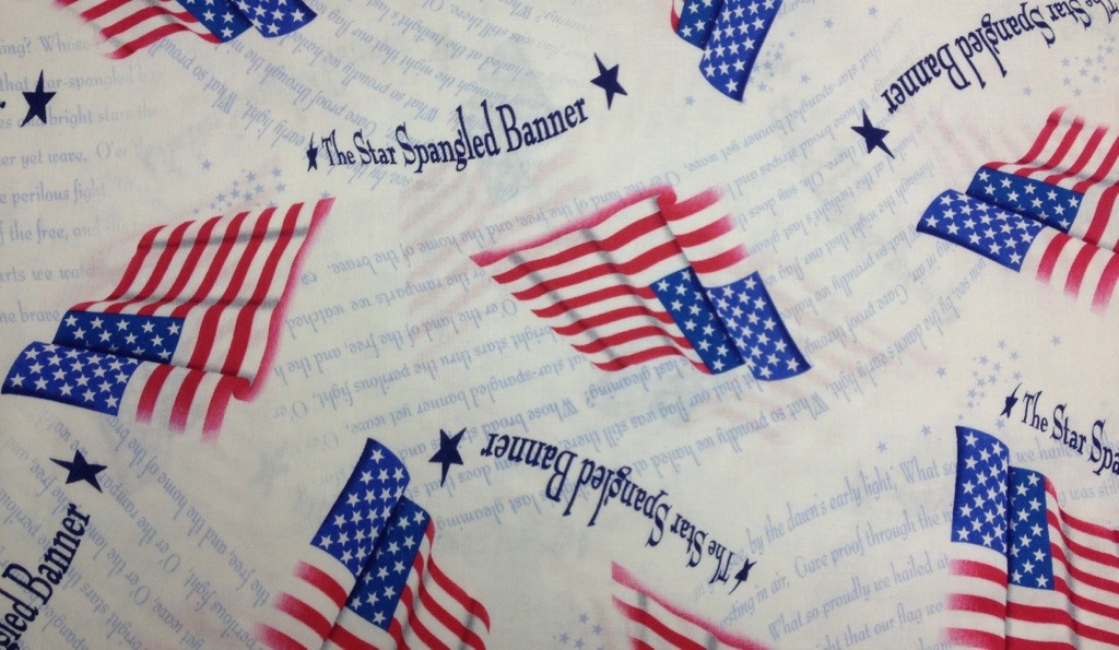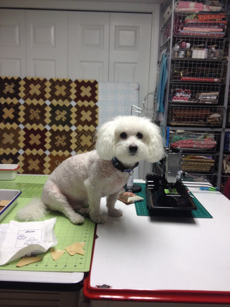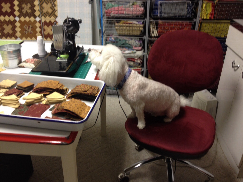What a smart puppy! He knows what the most important thing in your sewing room is – just been waitin’ to show you just how smart he is 😉 Love those patriotic fabrics, should make into a wonderful quilt!